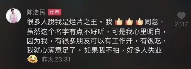 “很多人说我是烂片之王,我同意,因为我,有很多朋友可以有工作开,有饭吃,我就心满意足了,如果我不拍,好多人失业。”
