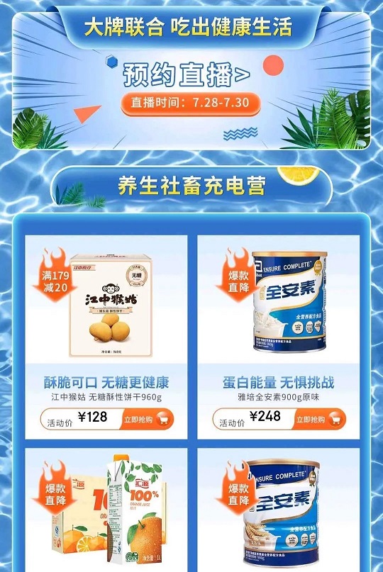 据介绍,此次活动中,汇源、江中、雅培三大品牌从均衡营养角度出发,为广大消费者贴心制定了“养生社畜充电营”、“全家嗨购健康营”、“夏日欢聚礼品营”三大营养选购套餐,充分满足消费者个人养生、家庭常备分享、节日拜访等多种场景健康需求。除此之外,汇源等品牌还为消费者准备了2件八折、优惠满减、幸运抽奖等多重福利,助力消费者乐享健康生活。7月28日~30日期间,江中、雅培还同步开启了店铺直播,为消费者带来更多惊喜体验。